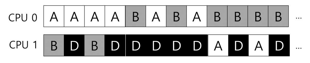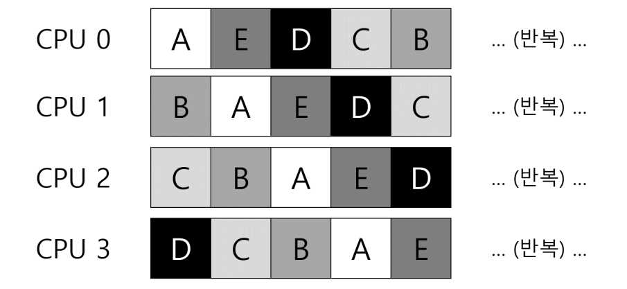 아주 단순하다. CPU가 1개일 때는 작업을 하나씩 선택해서 실행했고, CPU가 2개일 때는 작업을 두개씩 선택해서 실행하면 된다. 하지만 단점이 있다.