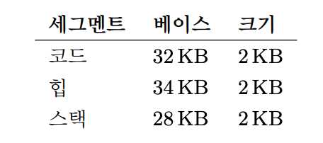 이 예제의 경우 3쌍의 베이스와 바운드 레지스터 집합이 필요하다.