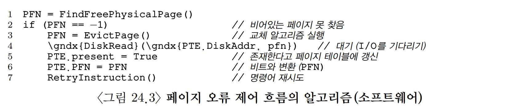 디스크 IO가 완료되면 운영체제는 해당 PTE의 PFN 값을 탑재된 페이지의 메모리 위치로 갱신한다. 이 작업이 완료되면 페이지 폴트를 발생시킨 명령어가 재실행된다. 재실행으로 인해 TLB 미스가 발생할 수 있다. TLB 미스 처리 과정에서 TLB 값이 갱신되고, 최종적으로 마지막 재실행 시에 TLB에서 주소 변환 정보를 찾아 이를 통해 물리 주소에서 원하는 데이터나 명령어를 가져온다.