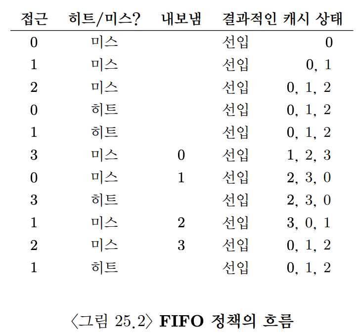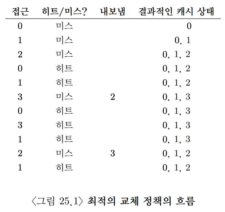 페이지 3을 처음으로 접근할 때, 캐시 미스가 발생한다. 어떤 페이지를 내보내야 할까? 0, 1, 2 중에서 가장 나중에 접근한 2를 내보내는 것이 최적이다.
