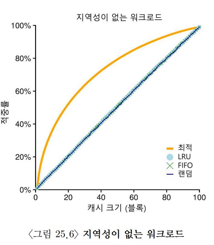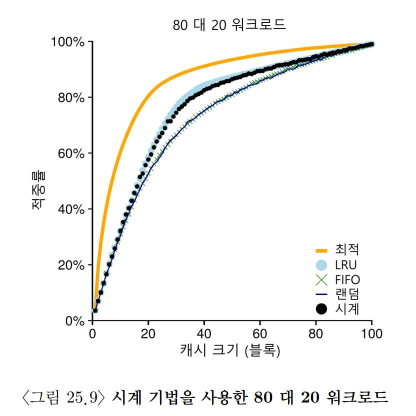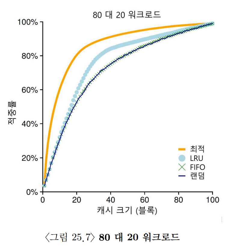 80대 20 워크로드는 20%의 페이지들에서 80%의 참조가 발생하고, 나머지 80%의 페이지에서 20%의 참조가 발생한다. 인기 있는 페이지를 두는 LRU가 더 좋은 성능을 보인다.