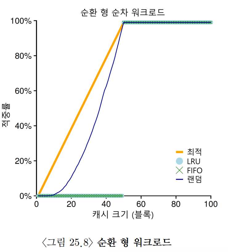 LRU와 FIFO 정책에서 좋지 못한 성능을 보인다. 오래된 페이지를 내보낸다는 특성으로 인해 캐시 크기가 49라고 할지라도 50개 페이지를 순차 반복하는 경우 히트율이 0%가 된다.