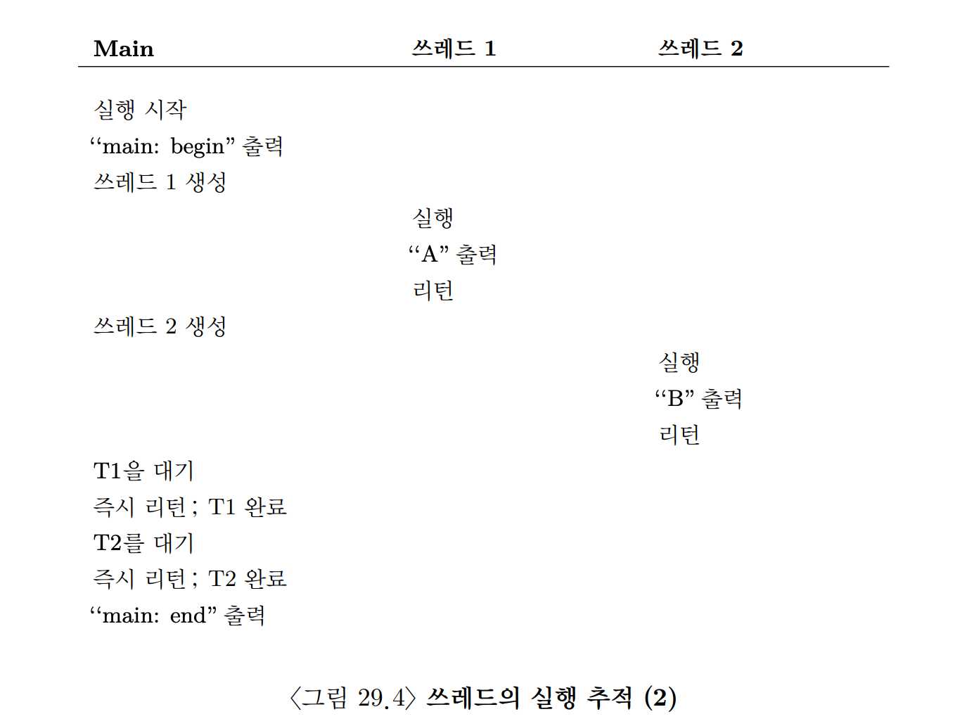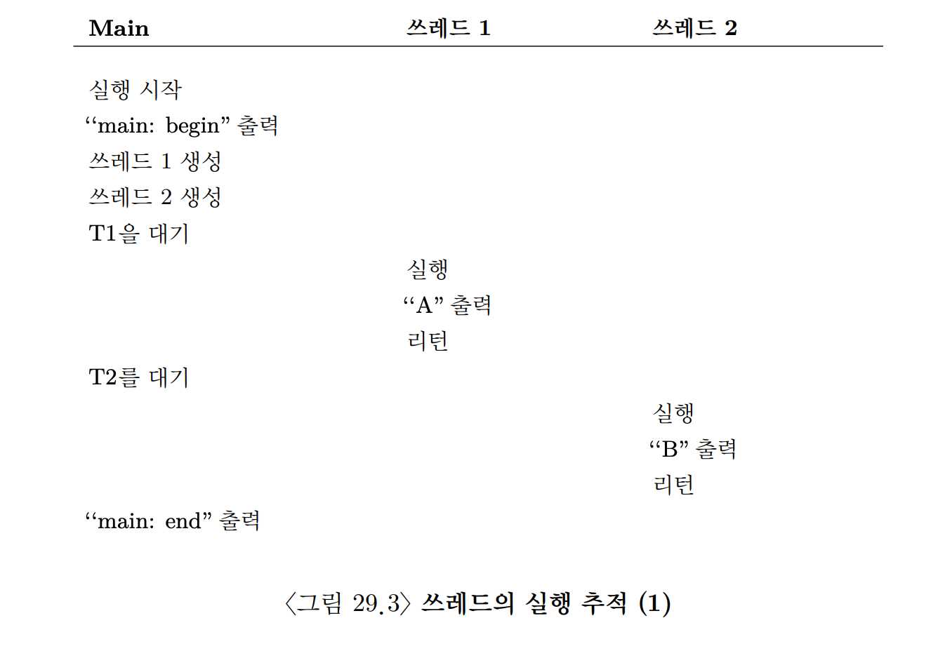 두 개의 쓰레드를 생성한 후에 메인 쓰레드는 pthread_join()을 호출하여 특정 쓰레드의 동작의 종료를 대기한다.