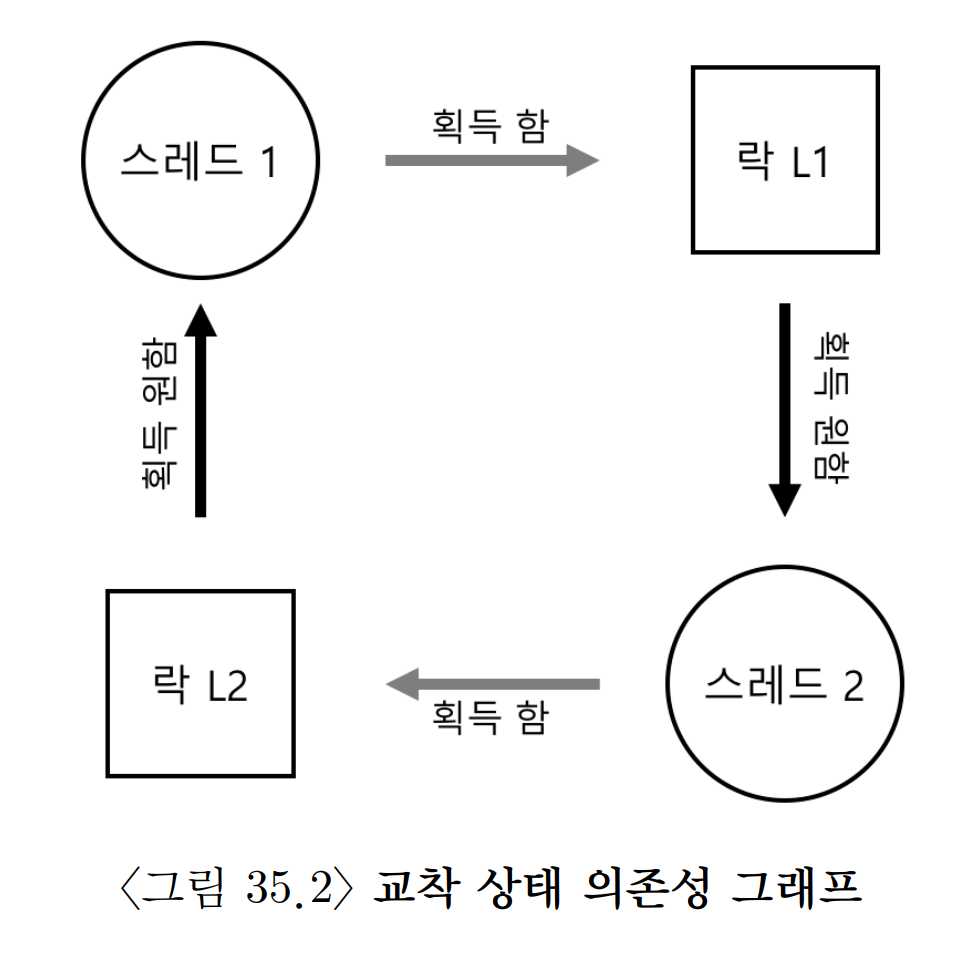 lock(L2); lock(L1);쓰레드 1이 락 L1을 획득한 후에 문맥 교환이 발생하여 쓰레드 2가 실행되고, 이 때 쓰레드 2가 락 L2를 획득하고 락 L1을 획득하려고 시도하면 교착 상태가 발생한다.