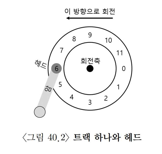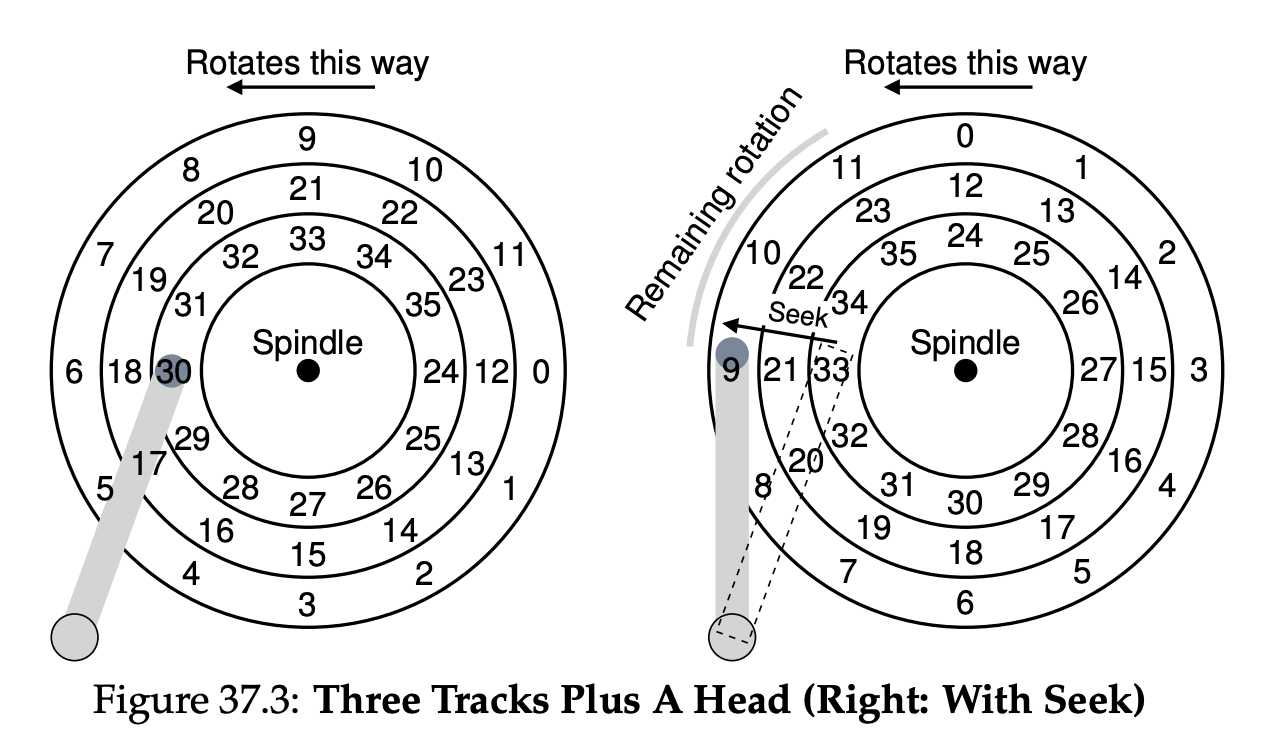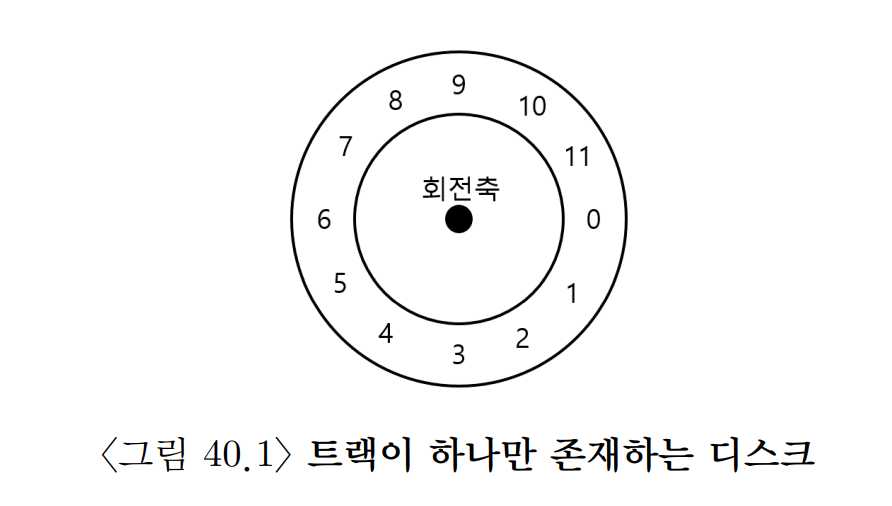 우선 현대 디스크 드라이브의 인터페이스부터 이해해보자. 모든 현대 드라이브의 기본적인 인터페이스는 단순하다. 드라이브는 읽고 쓸 수 있는 매우 많은 수의 섹터 (512 byte 블럭)들로 이루어져 있다. 디스크 위의 개의 섹터들은 부터 까지의 이름이 붙어 있다. 그렇기 때문에 디스크를 섹터들의 배열로 볼 수 있고, 부터 이 드라이브의 주소 공간이 된다.