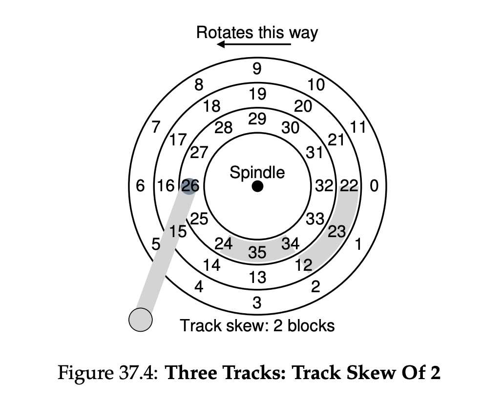 연속적인 트랙에서 데이터를 읽거나 쓸 때, 헤드가 한 트랙에서 다음 트랙으로 이동하는 시간을 고려하여, 다음 트랙의 시작 섹터를 해당 딜레이만큼 “skew”한다. 여기서는 2개 뒤로 skew 되어 있다.