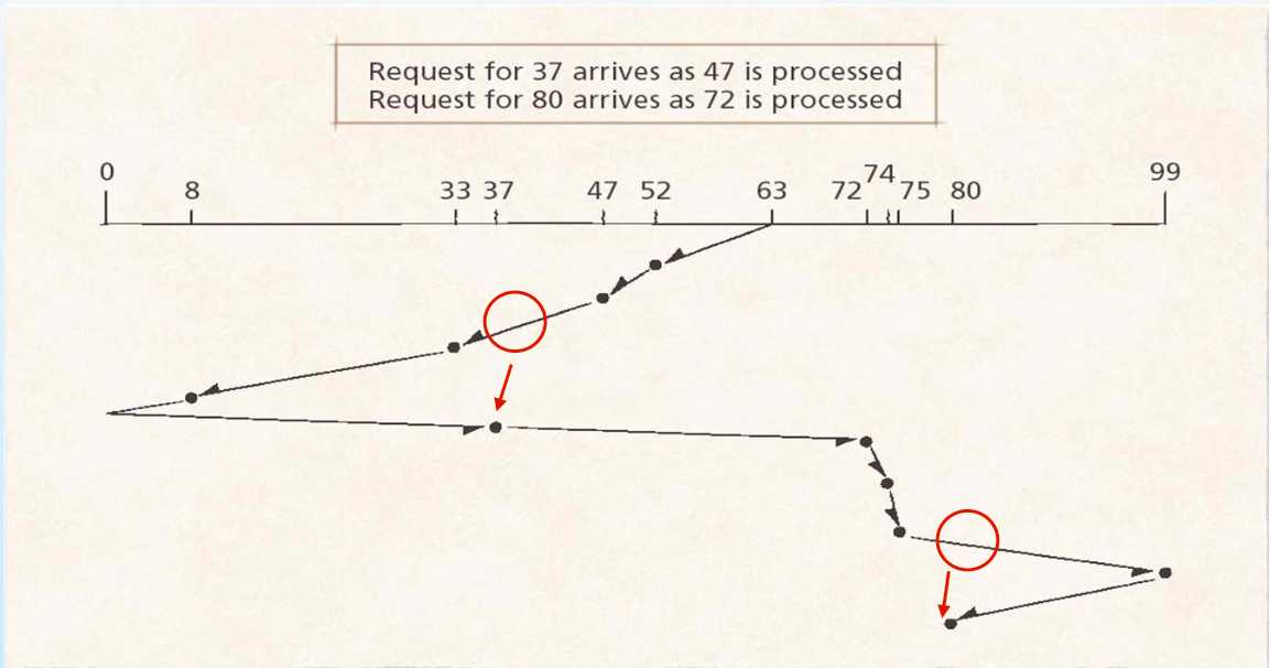 SCAN이라고 불렸던 이 알고리즘은 트랙의 순서에 따라 디스크를 앞뒤로 가로지르며 요청을 서비스한다. 디스크를 한 번 가로지르는 것을 sweep 이라고 부르자. 따라서 어떤 요청이 이번 스위프에 이미 지나간 트랙에 대해 들어온다면, 다음 번 스위프에 처리되도록 큐에서 대기한다.