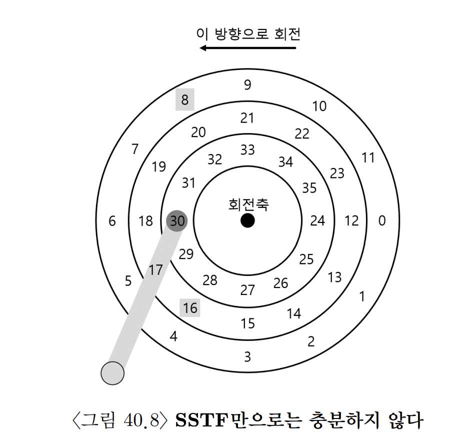 헤드가 섹터 30번에 위치해 있는데, 스케줄러는 다음 요청을 처리하기 위해 8번 섹터로 가야할까 아니면 16번 섹터로 가야할까? 정답은 상황에 따라 다르다.