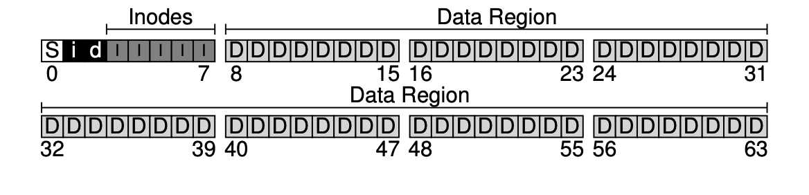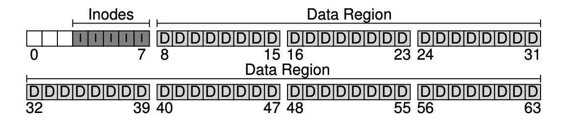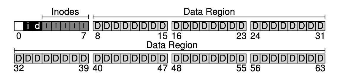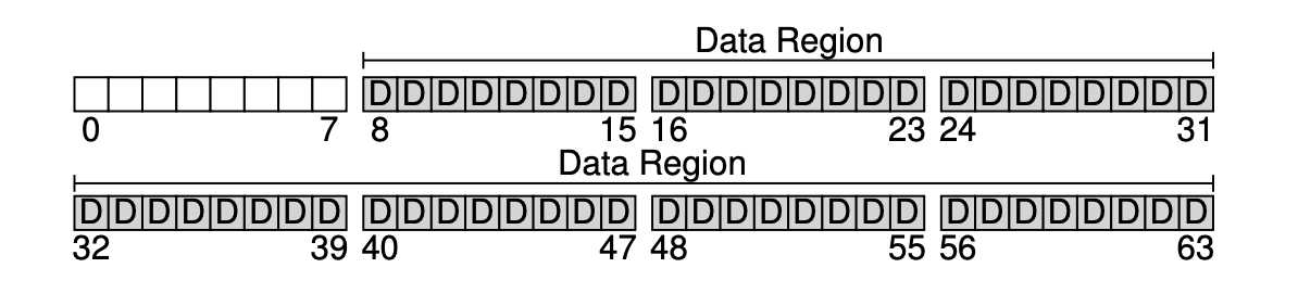 가장 먼저 해야 할 것은 디스크를 블럭(block) 단위로 나누는 것이다. 단일 블럭 크기만 사용하고, 4KB로 정하자. N개의 4KB 블럭 크기를 가지는 파티션에서, 블럭은 0부터 N-1까지 주소를 가지고 있다. 블럭이 64개 있는 작은 디스크를 생각해보자.