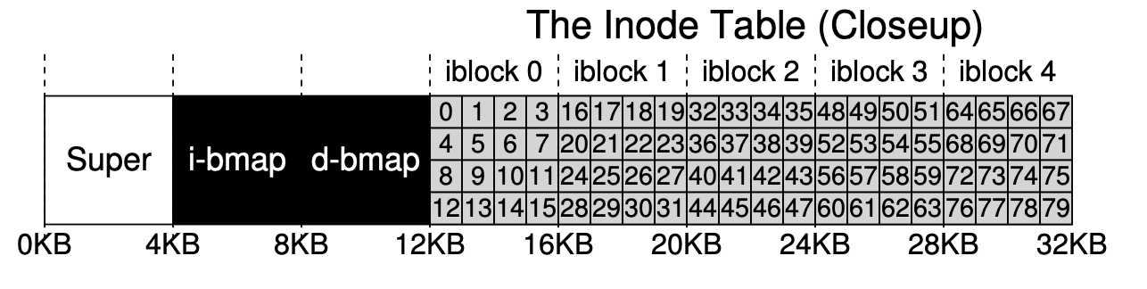 남은 한 블럭은 슈퍼블럭(superblock) 을 위한 공간이다 (S로 나타냄). 슈퍼블럭은 이 파일 시스템 전체에 대한 정보를 담고 있다. 예를 들어, 파일 시스템에 몇 개의 아이노드와 데이터 블럭이 있는지, 아이노드 테이블은 어디서 시작하는지와 같은 정보를 가지고 있다. 파일 시스템을 식별할 수 있는 매직 넘버도 가지고 있다. 파일 시스템이 깨진다는 것은, 슈퍼블럭이 저장된 디스크 블럭이 훼손되는 것이다. 일반적으로 파일 시스템은 슈퍼블럭을 몇 개 복사해둔다.
