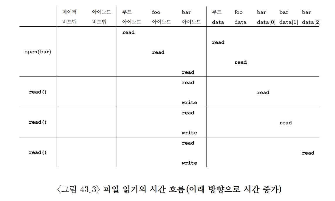 이 그림에서는 파일을 여는 과정 중에 파일의 아이노드를 찾기 위해서 여러 번의 읽기가 일어나는 것을 보여주고 있다. 그 뒤에 각 블럭을 읽기 위해서 파일 시스템은 먼저 아이노드를 읽고 블럭을 읽는다. 그리고 아이노드의 마지막 접근 시간을 갱신한다. 무슨 일이 발생하는지 다시 한 번 차분히 이해해 보자.