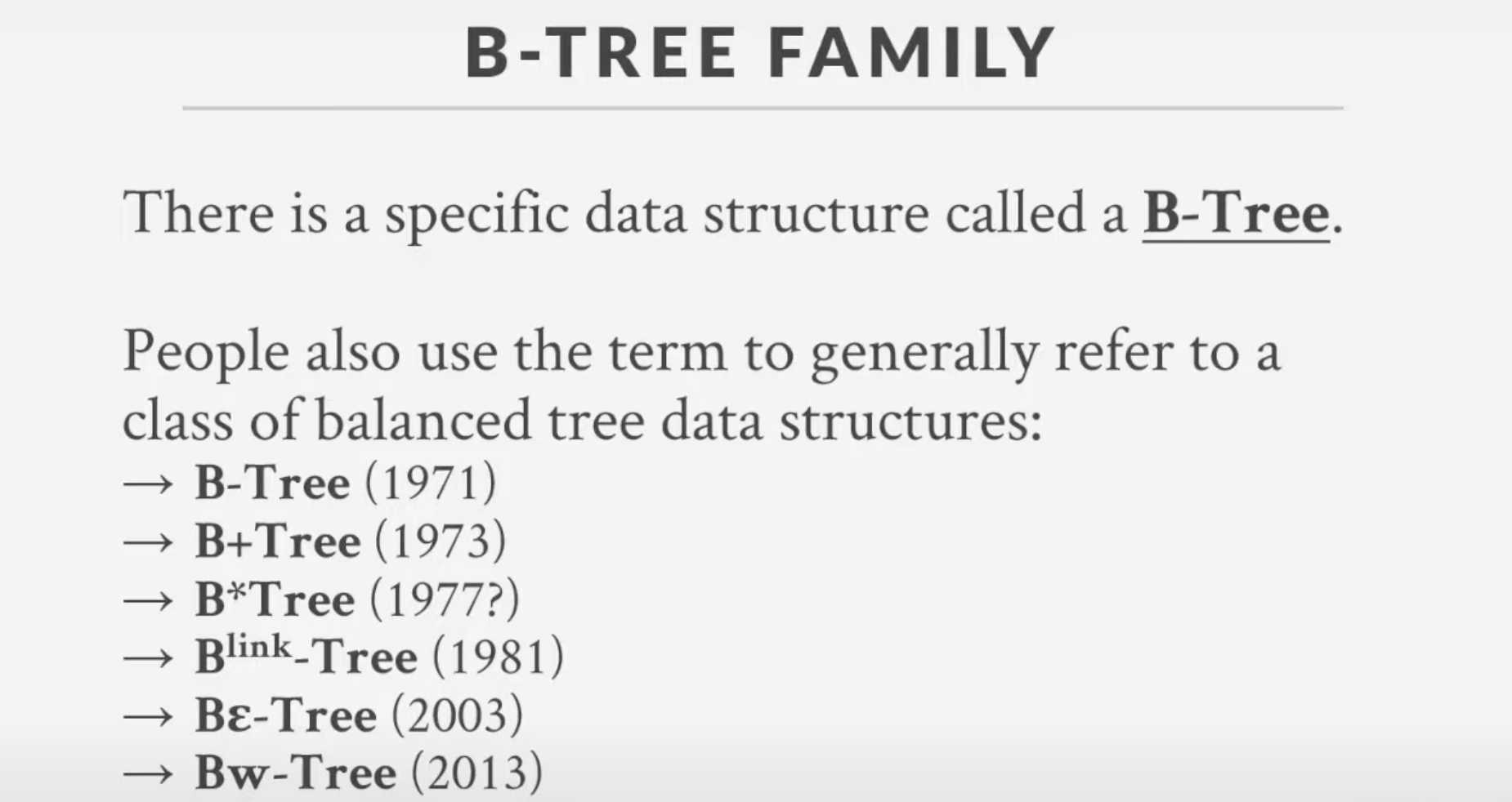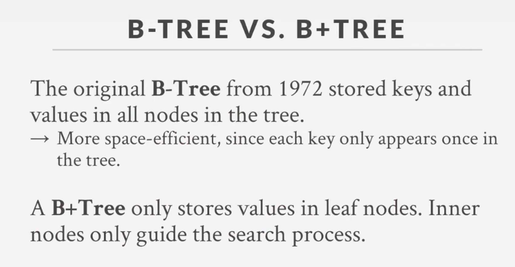 B-Tree는 가장 중요하고, 가장 일반적으로 사용되는 인덱스이다. B-Tree의 ‘B’는 “Balanced”이다. 인덱스로 설정한 원본 값을 변형시키지 않고, 정렬된 상태를 유지한다.