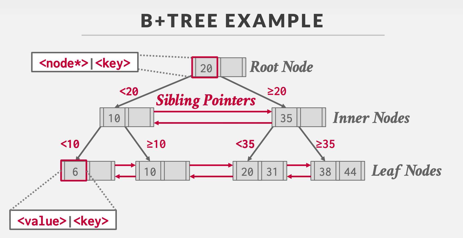 B-Tree는 루트 노드 - 브랜치 노드 - 리프 노드의 구조를 가지고 있다. 반드시 최상위에 하나의 루트 노드를 가지고 있다. 최하위의 리프 노드들은 실제 데이터 레코드를 찾아가기 위한 주소를 가지고 있다. 다른 노드들은 하위 노드들의 주소를 가지고 있다(B+Tree).
