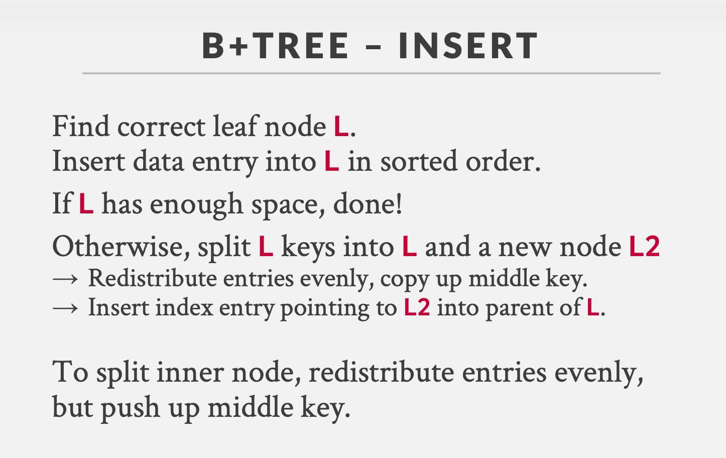 새로운 키 값이 트리에 추가될 때, 키 값을 이용해 트리에서 저장될 위치를 찾아야 한다. 저장될 위치가 결정되면 키 값과 레코드의 주소 정보를 트리의 리프 노드에 저장한다. 이 때 리프 노드가 꽉 차서 공간이 부족한 경우, 노드를 반으로 나눈다. 분할 시 중간값이 부모 노드로 복사된다.