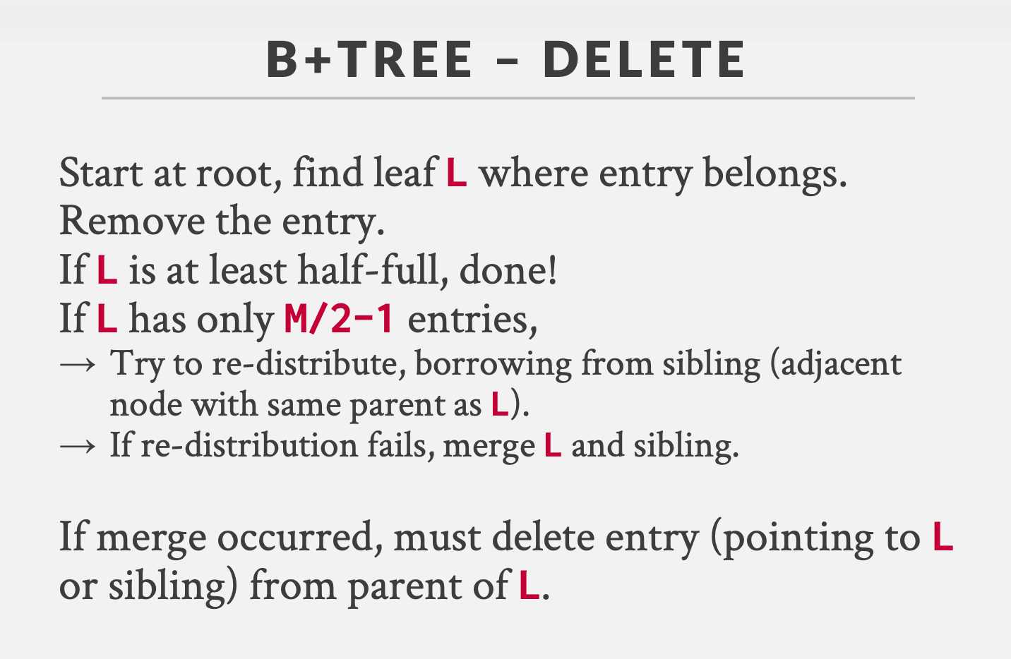 삭제할 키가 있는 리프 노드를 찾고, 해당 키를 삭제한다. 이 때 리프 노드에 존재하는 키 개수가 개가 되면, 형제 노드에서 키를 빌려 오거나 합쳐서 트리의 특성을 만족시킨다.